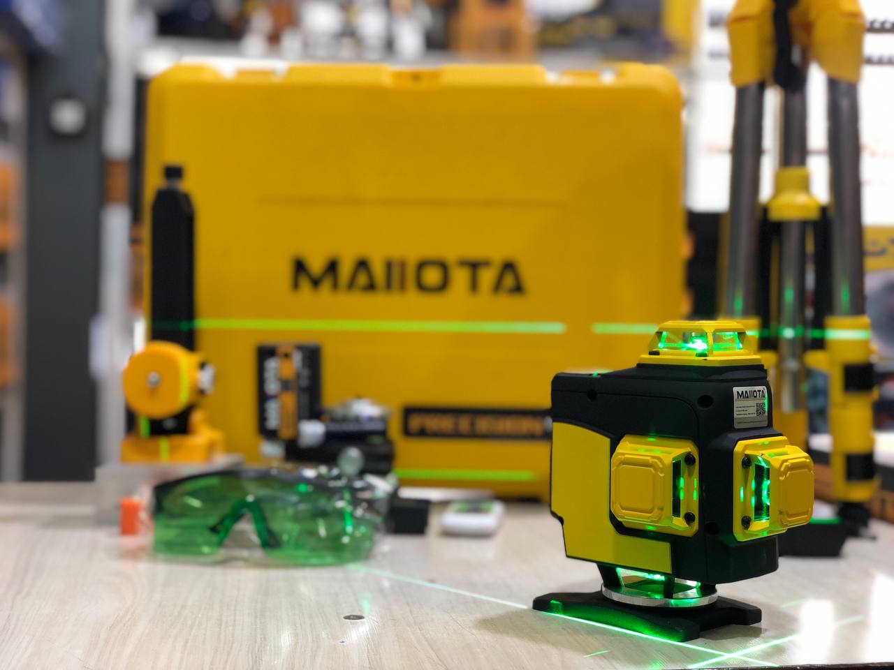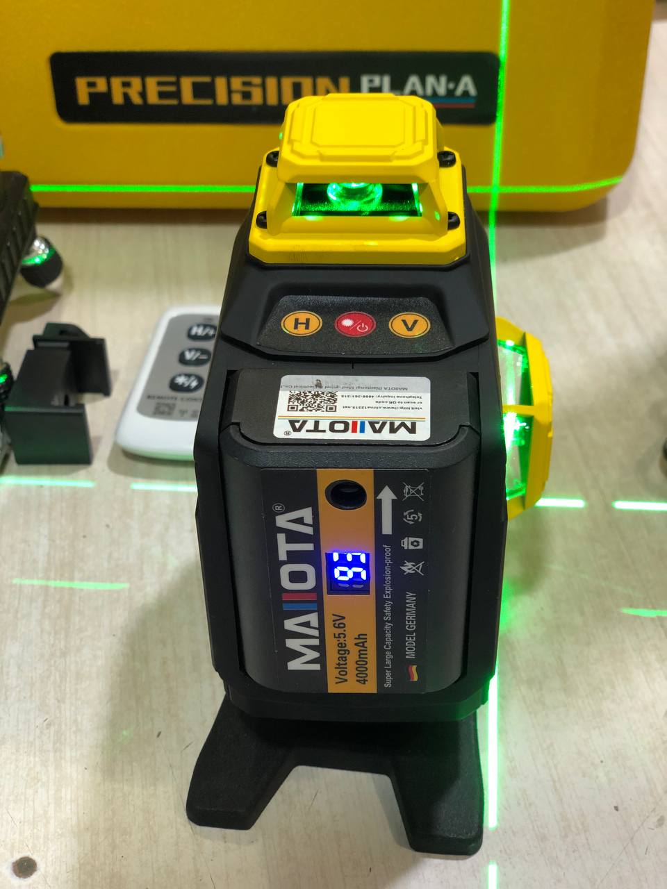 تراز لیزری مارک مایوتا ۴ لیزر ۳۶۰درجه دارای نشانگر بر روی باطری ۳ پایه استیل دارای پایه چرخشی پایه مگنتی درجه ۱ کیف MBC درجه ۱ ساخت چین درجه یک مدلGERMANY